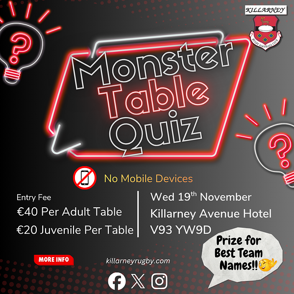 Get your team together and join us for what will be a brilliant evening in support of Killarney RFC.